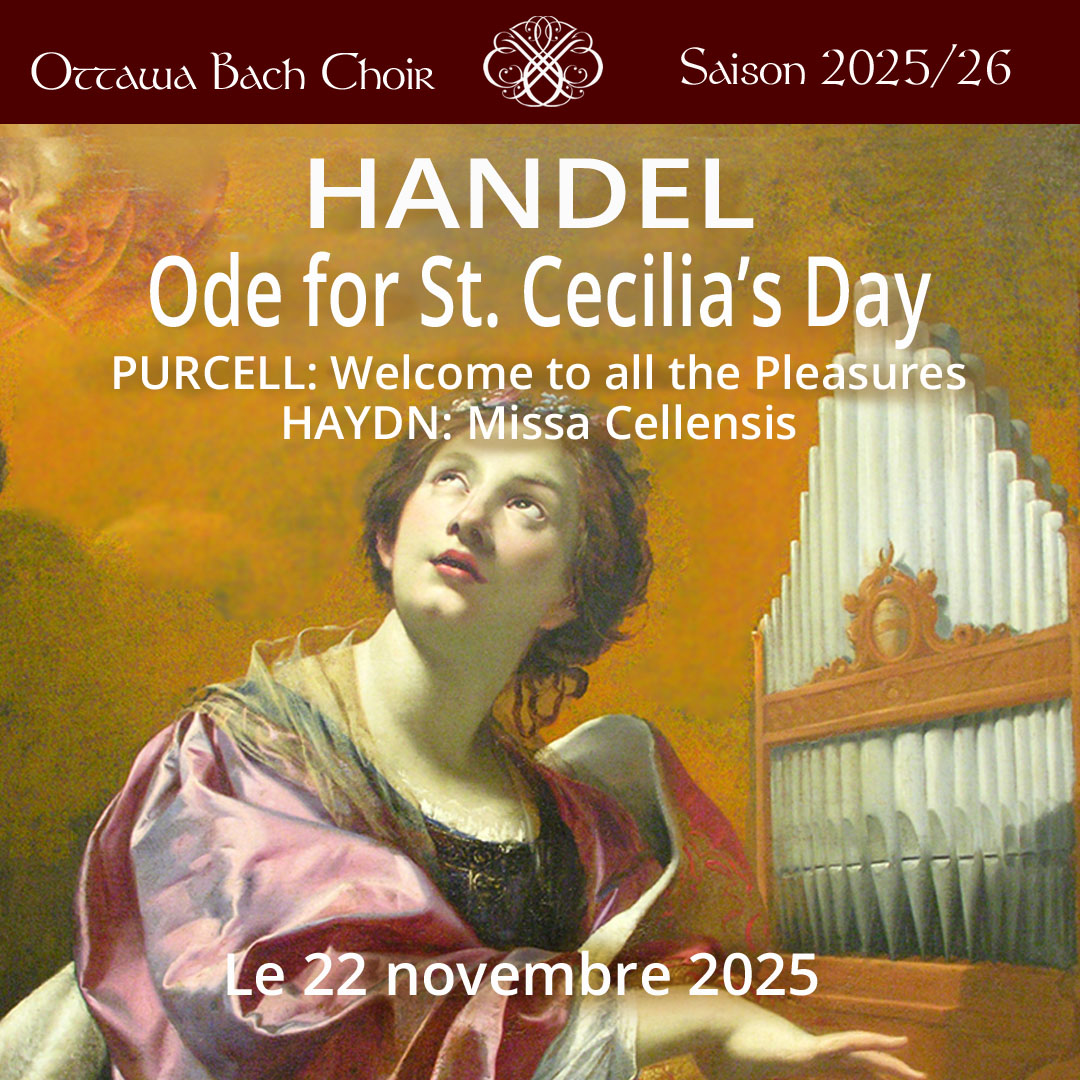 Ne manquez pas le premier concert de la 24e magnifique saison du Chœur Bach d’Ottawa, qui propose de la musique jubilatoire en l’honneur de la sainte patronne de la musique, Sainte Cécile, notamment l’Ode for St. Cecilia’s Day (Ode pour la Sainte-Cécile) de Hændel, Welcome to all the Pleasures de Purcell, et la Missa Cellensis de Haydn !